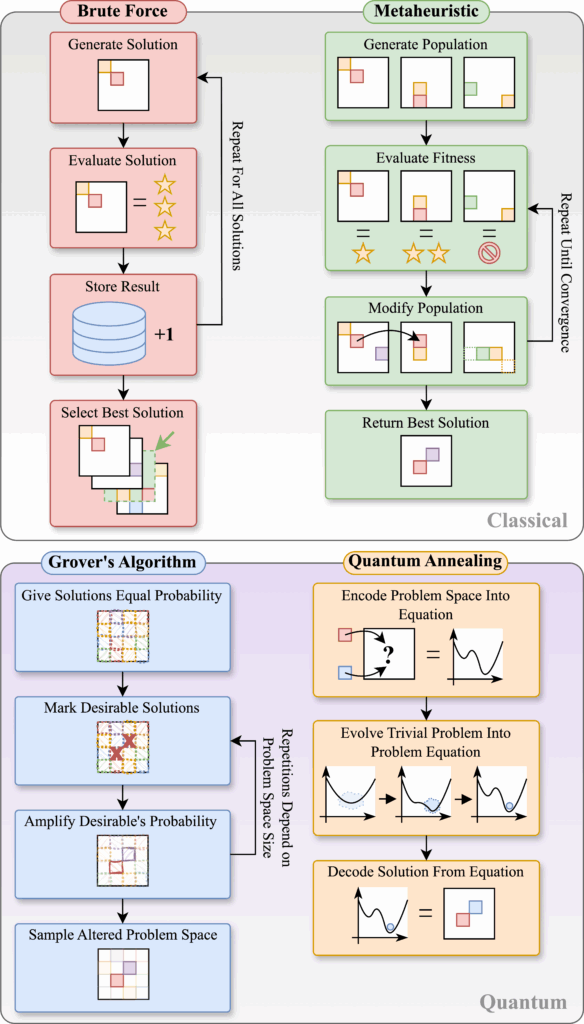Quantum computers are computers that use quantum phenomena to represent information. The smallest unit of information represented in a quantum computer is a quantum bit – referred to as a qubit. While classical computers process information in binary states (0 or 1), qubits can be in a state of 0, 1, or a superposition of both. This superposition enables quantum computers to perform computations in parallel and explore multiple solutions simultaneously. Taking advantage of superposition, as well as other QC features such as entanglement and tunnelling, has resulted in a number of quantum algorithms for tackling computational problems. However, a gap must be bridged between the available techniques and their implementation. The Figure below compares the operation of two classical and two quantum algorithms, to explain how taking advantage of these phenomena can enable algorithms with a novel operation.